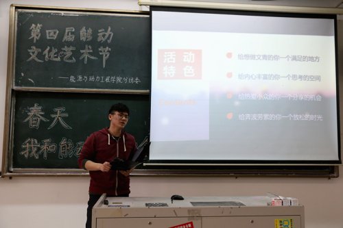 开幕式中,文化艺术节承办各子活动的部门代表依次上台介绍了相应的活动特色及活动流程,内容丰富,形式多样,引人入胜。此次文化艺术节集娱乐性、学术性于一体,既有趣味横生的“奔跑吧,能动”大型户外挑战赛,又有温情满满的“家书抵万金”活动,还有专业性十足的“热工知识竞赛”等。