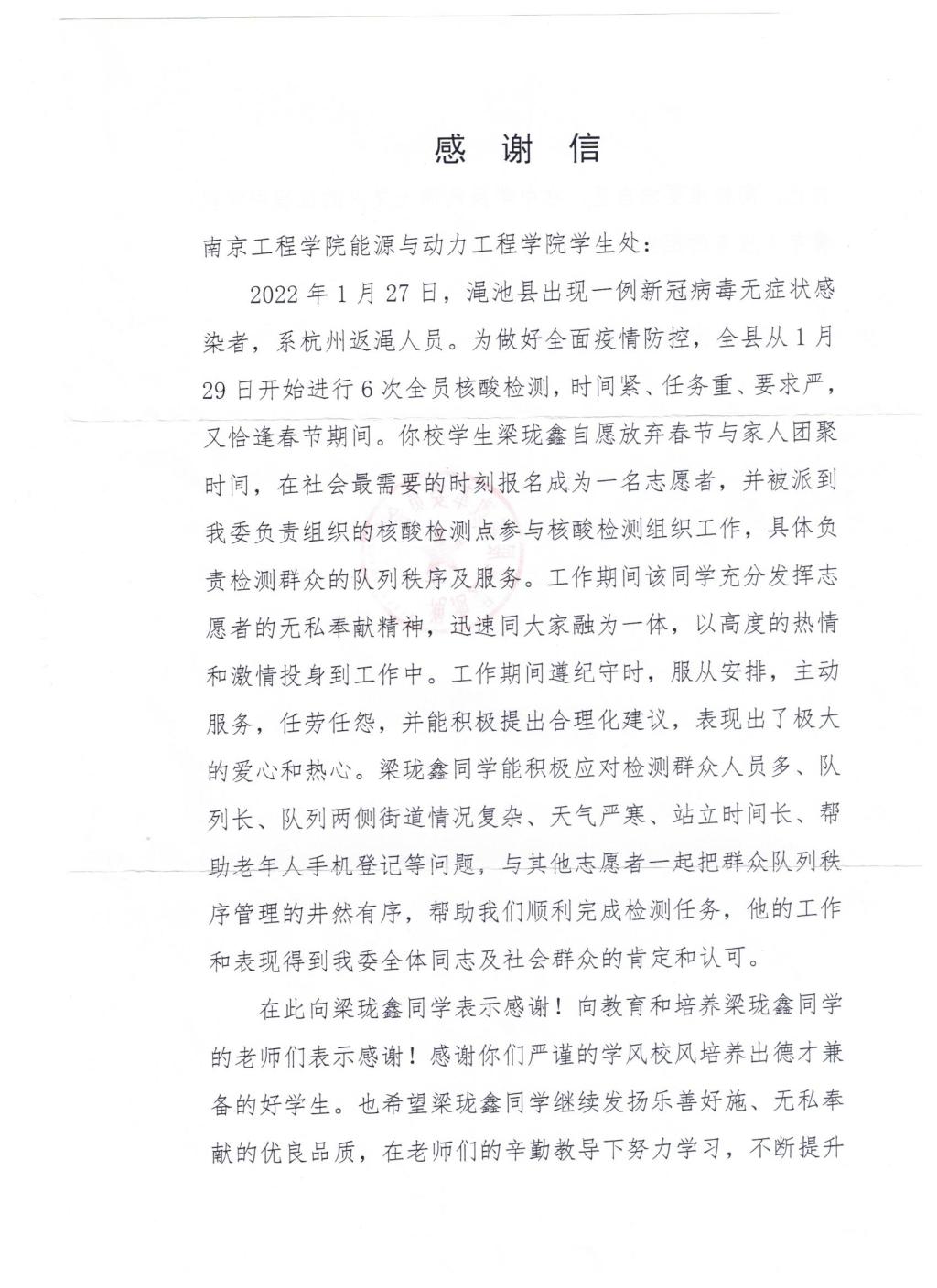 今年以来,国内新冠肺炎疫情呈现出多点状爆发的复杂态势。疫情发生后,我院新能源191班、学生第四党支部预备党员梁珑鑫,能动2102岳崇尚、能动2111彭家鸿等同学寒假期间,主动找到当地村(社区)报名,自愿加入到疫情防控和宣传工作中,协助做好出入登记、车辆引导,维持核酸检测秩序,检查行程码和健康码。每天从早到晚,在当地村(社区)防控点总是能看到我院学生志愿者忙碌的身影。对于少数不理解疫情防控的群众,他们总是耐心地宣传防控政策及卫生防疫知识,为当地居民答疑解惑。对于需要帮助的弱小,他们总是第一个冲在前面,尽力解决实际困难。他们时常和身边的其他防控员说:“作为新时代大学生,当国家需要我们的时候,我们理应义不容辞地站出来!”来信纷纷充分肯定我院学子的责任与担当,对我院每位教育教育者的辛勤培育表示感谢。