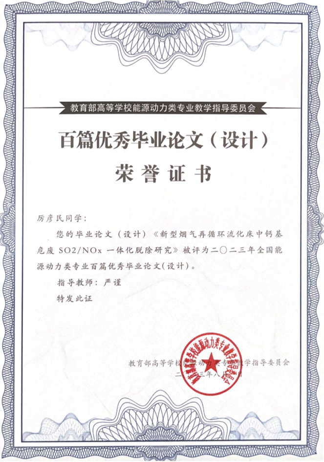 8月4日,教育部高等学校能源动力类专业教学指导委员会公布了2023年百篇优秀本科毕业论文(设计),由我院严谨老师指导的集控191厉彦民同学本科毕业论文《新型烟气再循环流化床中钙基危废SO2/NOx一体化脱除研究》入选,这是我院首次获得该奖项。