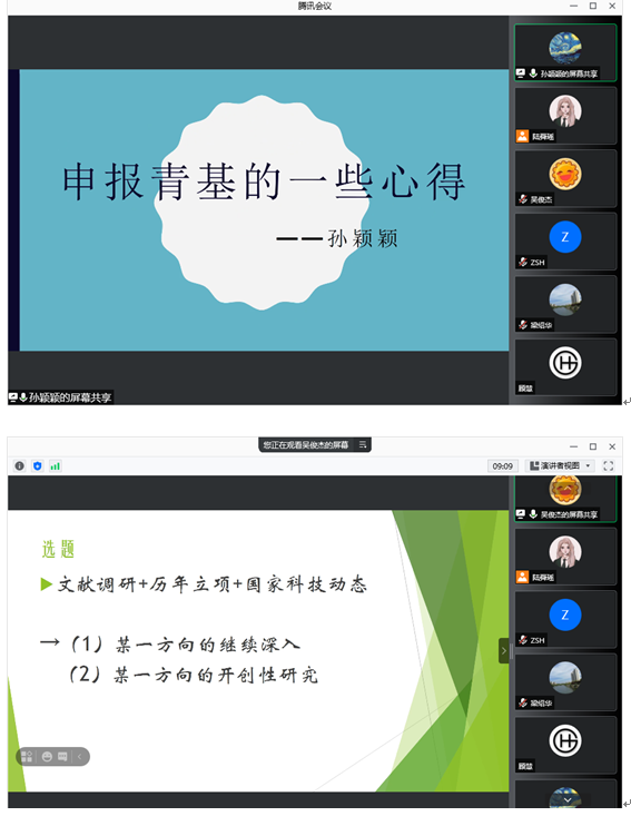 吴俊杰老师从申请书题目、科学问题属性、选题策略、立项依据、研究内容、拟解决的关键科学问题、研究方案及可行性、研究基础与工作条件等方面,全面介绍了自己的心得体会,形象生动地讲述了自己国家自然科学基金申报书的构思过程,并总结了2021版较2020版国基申报书的改进。孙颖颖老师强调立意创新、选题准确、研究内容精炼、可行性强的重要性,她指出基金申请书应聚焦创新点,避免工作量太大,注意关键科学问题的提炼,确认课题是否属于前沿领域,并强调与同行前辈交流的重要性。