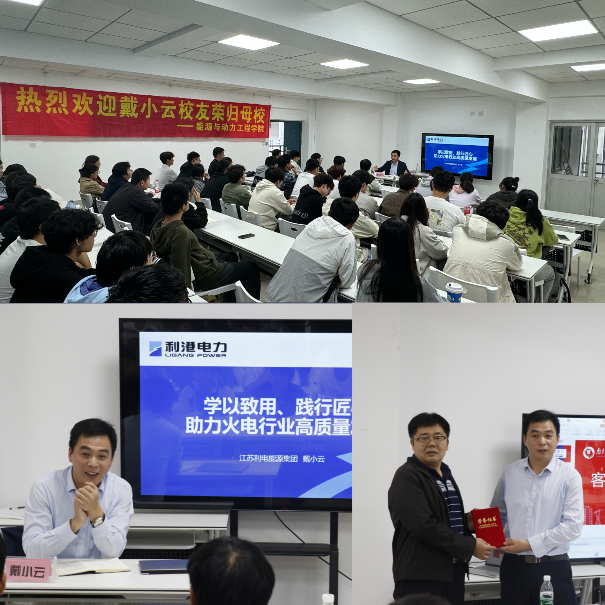 聘任仪式后,戴小云为师生代表作了一场以“学以致用、践行匠心,助力火电行业高质量发展”为主题的职业发展讲座,分享了自己毕业后逐步成长为劳动模范的职业成长经历,讲述了在基层工作中如何通过不断学习,善于钻研,最终成为行业内的技术能手;并重点介绍了他负责研发的“火力发电智能监盘系统”,通过大数据挖掘技术和人工智能技术有效解决了企业生产中的痛点问题,支持了企业甚至整个行业的高质量发展。在被问及“学生在校期间应该如何有效学习”这一问题时,戴小云校友强调了专业技能的重要性,并鼓励在座的同学们要脚踏实地、勇于追梦、不畏挑战、坚持创新,为推动能源强国贡献青春力量。