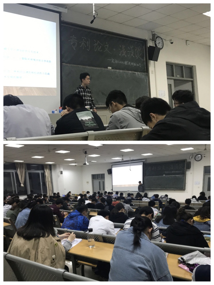 在东302教室举办了“专利论文•浅浅谈”专题讲座,邀请了该院在专利申报与授权、论文发表等方面取得优秀成绩的学生代表——来自集控162班的何文杰向到会的200多位同学做了一次精彩的交流。