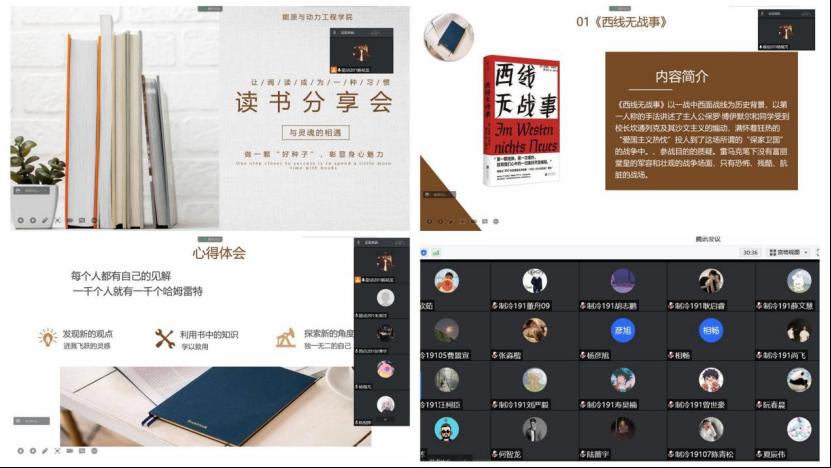 “读书,是自己与灵魂的遇见,给予生命坚持的力量”。同学们在屏幕前互相分享着自己的阅读感言,一场别开生面的读书分享会正在云上展开。近日,学院以“阅读的力量”为主题开展线上读书分享会,提高学生的心理保健意识和心理健康水平,培育关爱自我,热爱生活的阳光积极心态。活动开始之前,主持人能动205班陈倪烨请参会的同学提前准备一本书作为分享对象,并与参会的同学约定“要保持高度开放的态度,真诚且包容,即使有些同学的观点我们不能完全理解,但要尊重彼此的想法,毕竟一千个人有一千个哈姆雷特”。同学们在分享过程中畅所欲言。能动203班杨稼芃在分享《西线无战事》时,由衷的感慨,“真希望所有人能安心快乐的生活,不再为生死堪忧,不再为未来绝望。作为能动学子,我想为社会发展与世界和平注入青春动能”。