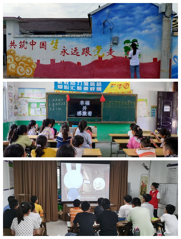 “桑梓情·雏鹰梦”“心愿支教”团队分别走进丰县王沟镇中心小学和江宁上坊社区,开展“大手牵小手 童心跟党走”红色教育主题实践活动,在孩子们心中播下爱国的种子,培养勇敢坚毅的精神。“画说振兴”团队则前往扬州市宝应县三联村,以当地产业特色为绘画素材,以“乡村振兴”为主题,将党史100年的辉煌历程、新农村建设、生态文明等内容融入到墙绘作品种,展现美丽乡村新面貌。