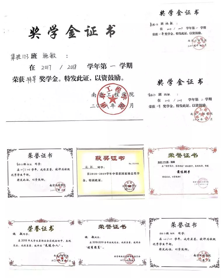 夜色中点点繁星和深夜依1旧明亮的灯见证着一切的勤奋和坚持。入学以来,她的智育成绩和综测排名均在专业名列前茅,凭借自己的努力先后获得了国家奖学金、国家励志奖学金,校级特等奖学金,校级一等奖学金等,在大一大二时便顺利通过了英语四六级,全国以及江苏省计算机一、上级。此外,她还参与了《电动车车载自动伸缩雨棚》、《基于云数据库的过程模拟和数据平台》等多个大学生科技创新项目,并且顺利结题。学习以求进步,尝试以求超越,博学进取,行稳致远。优异的学习成绩和充实的课余生活离不开她每一次的勇敢尝试和脚踏实地的辛勤努力。