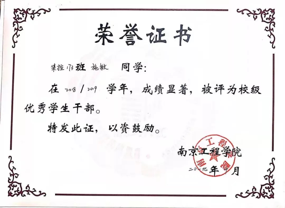 学生党建办公室从干事到副科长再到主任助理,三年的学生工作经历成为了她大学生活里浓墨重彩的一笔。期间,施敏主要负责申核学生党员材将,组织觉员实践活动,协助学院完善学生党员发展机制,规范学生党员发展流程。每一次身份的转变,每一项工作的完成,都是压力与成就感的交织。对部门的辛勤付出和良好表现也让她连续两年获得了"校级优秀学生干部〞的荣誉称号,得到了老师和同学的一致认可。